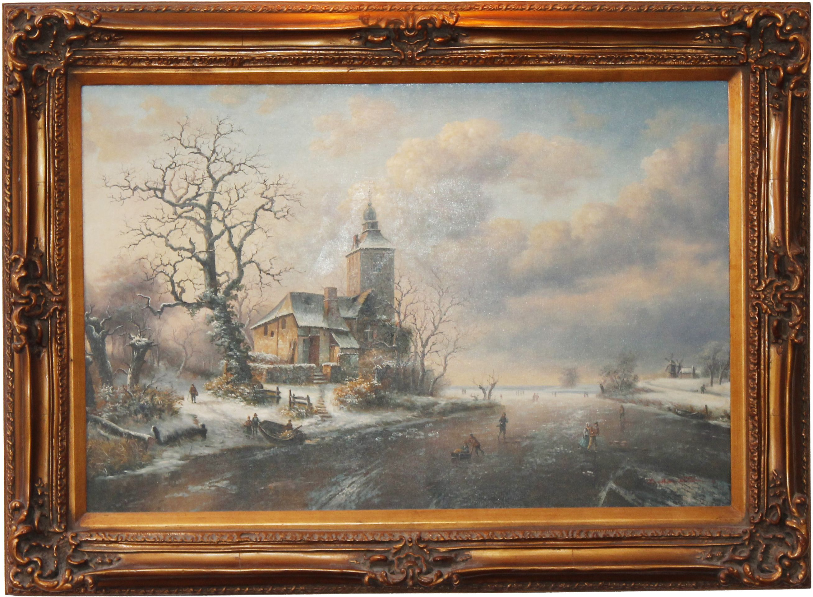 Duży i atrakcyjny angielski obraz olejny na płótnie, w ozdobnej ciężkiej złoconej ramie, sygnowany E. Hamilton, XX wiek.Obraz namalowany w stylu XVII-w. holenderskich i flamandzkich scen zimowych.Rozmiar płótna: 56 x 89 cm.