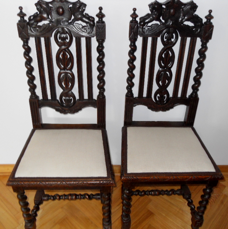 w XVII-w. stylu Jacobean, połowa XIX w., z herbem lwów na oparciu. Nowa tapicerka, krzesła po niedużej renowacji.Wymiary: 45 cm